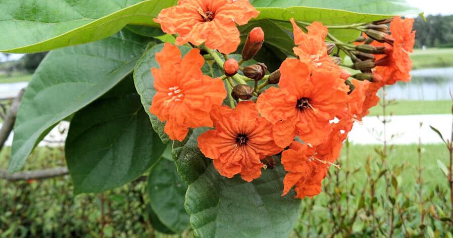 The orange geiger Cordia sebestena is the most well-known with showy deep orange flowers that contrast nicely against the trees coarse green leaves. The large 4 to 9-inch-long stiff.